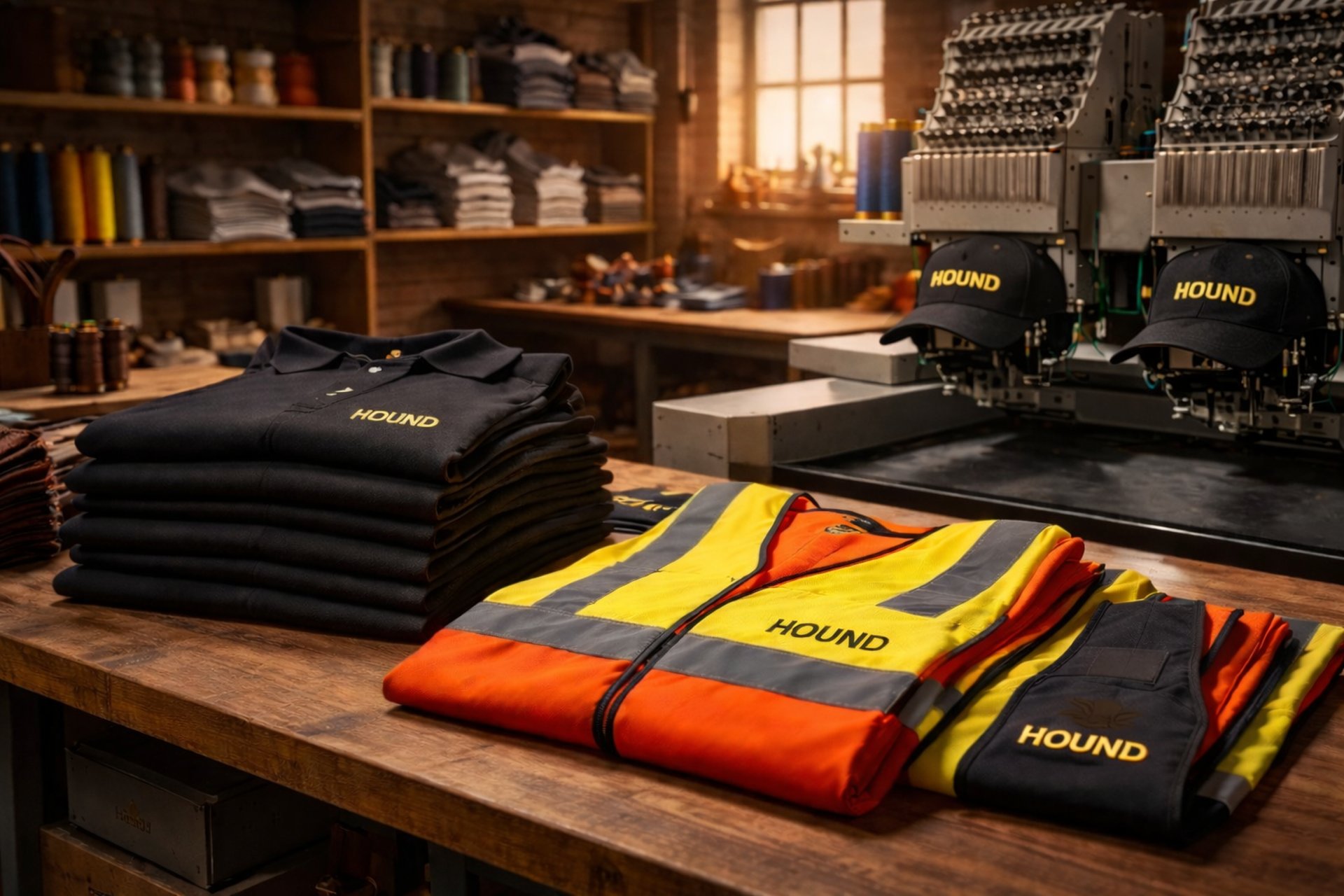 En HOUND diseñamos, estampamos y bordamos ropa corporativa y ropa de seguridad para empresas, marcas y equipos de trabajo que buscan una imagen profesional, uniforme y funcional.